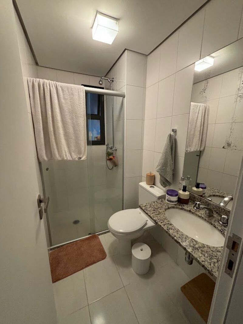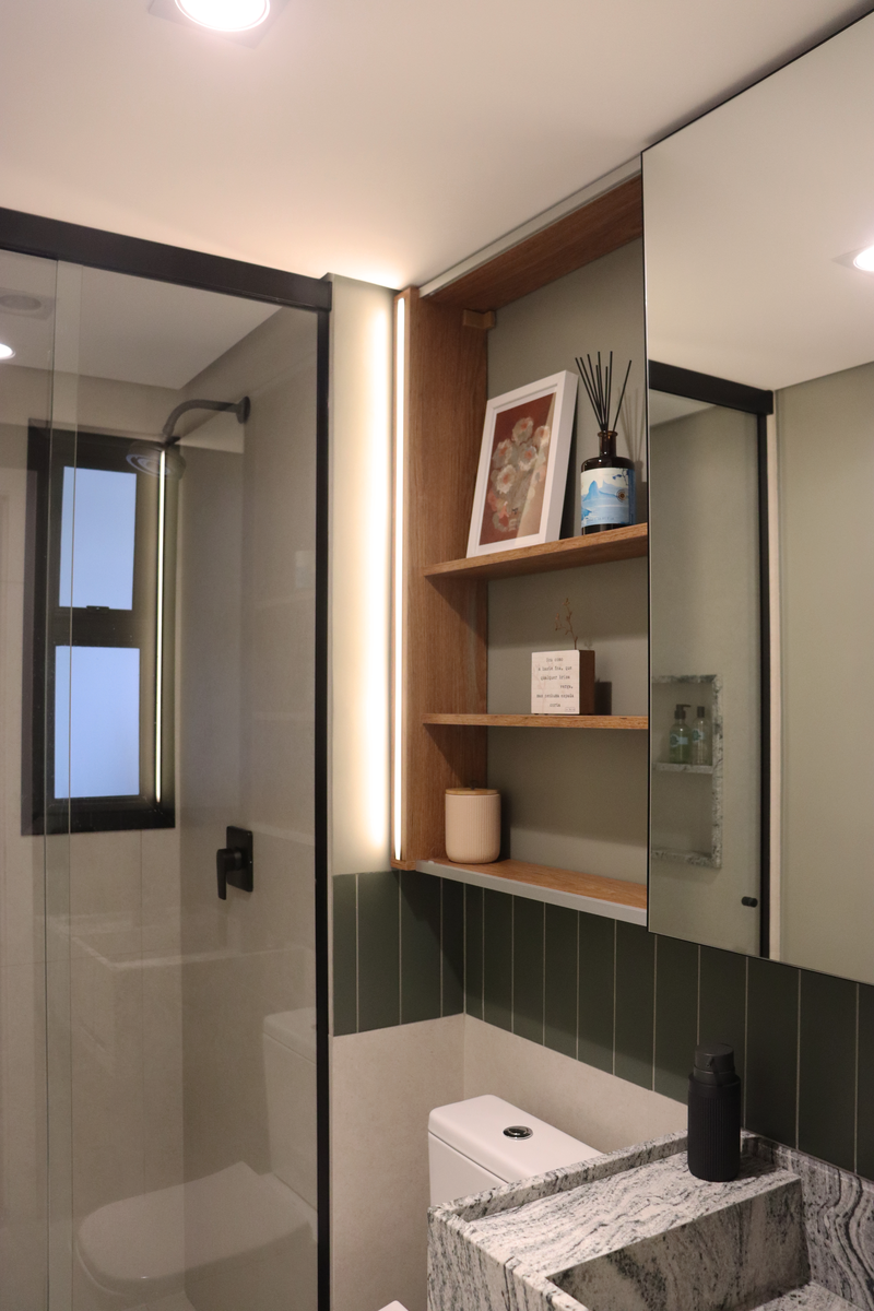 Dois banheiros e duas demandas nortearam esse projeto. O banheiro da suíte precisava ser bem clean mas aconchegante - o sonho da cliente - e o banheiro social precisava ficar com cara de lavabo, ambos atemporais.