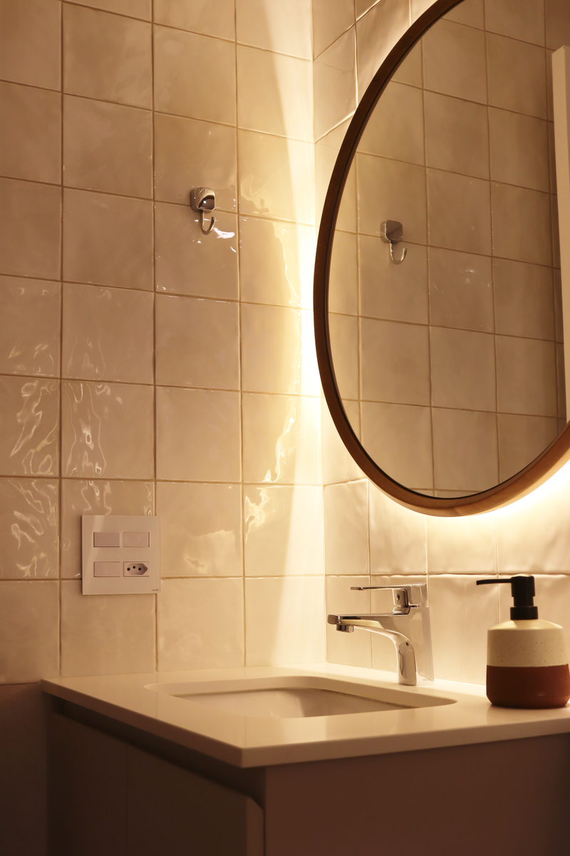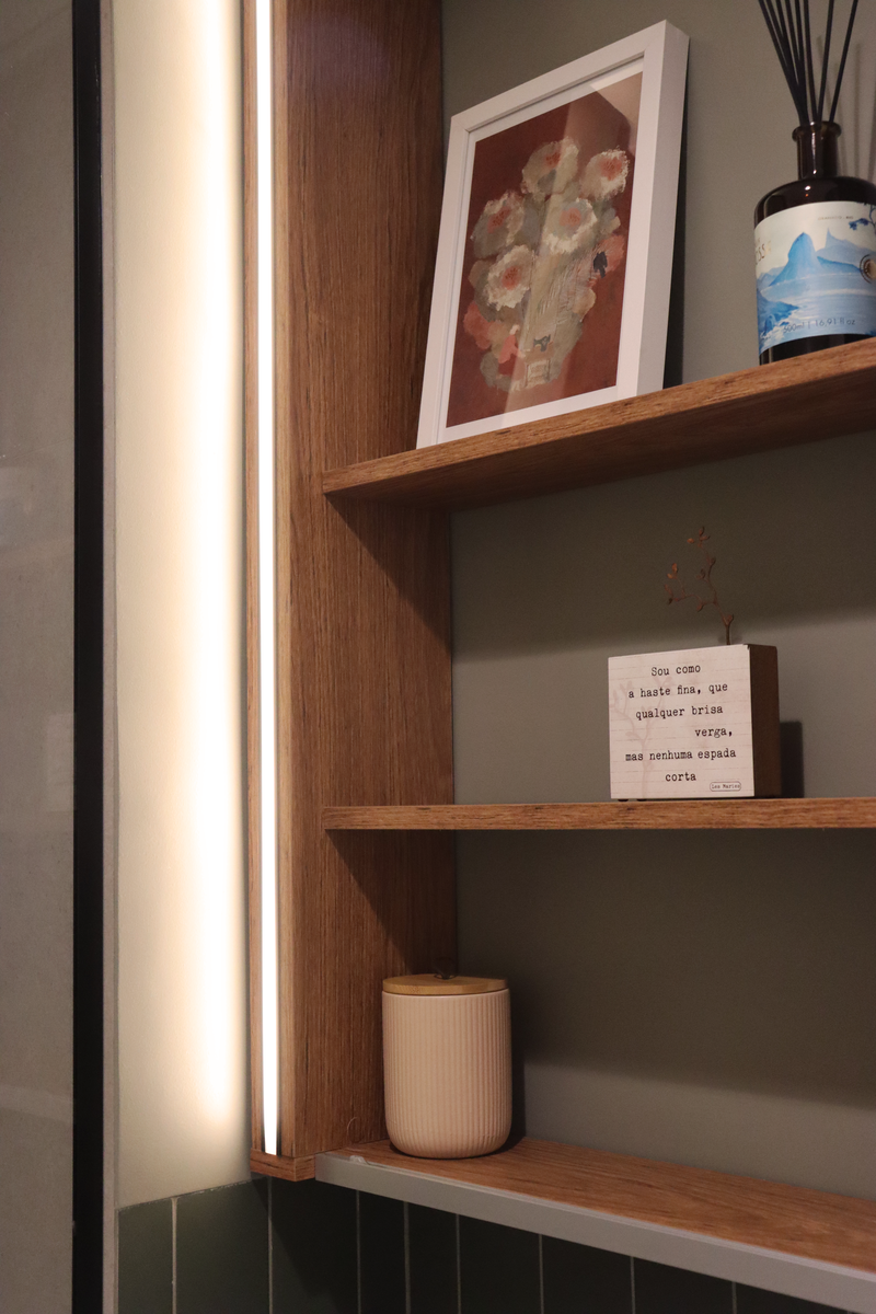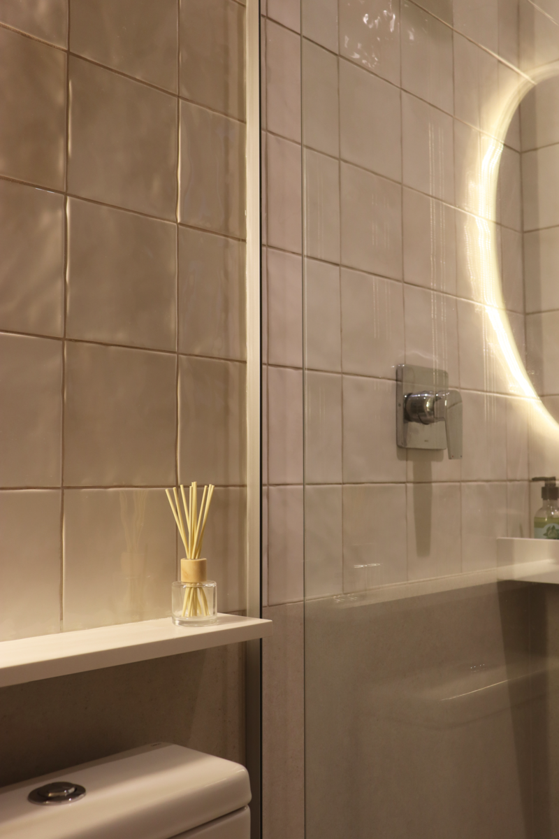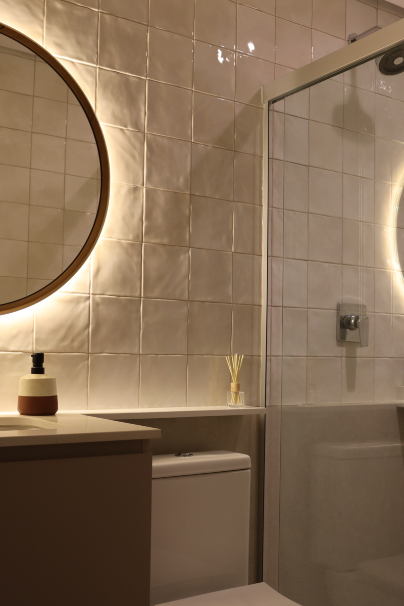 Na suíte, a meia parede com o Gouache Nuage - Portobello - trouxe leveza e ao mesmo tempo movimento, a pedra em quartzo branco, os metais cromados e a marcenaria em tom neutro deixaram o banheiro mais clean. O aconchego veio no espelho de madeira natural com iluminação indireta.