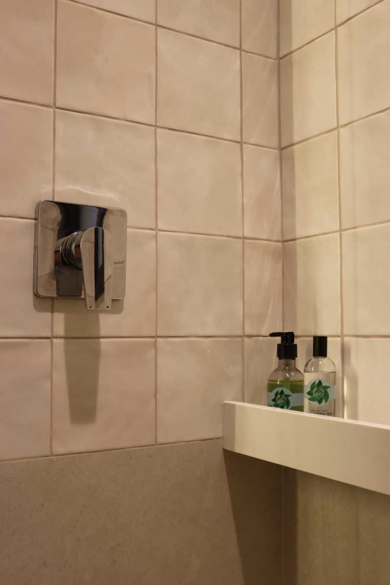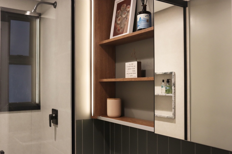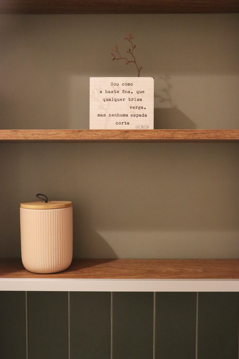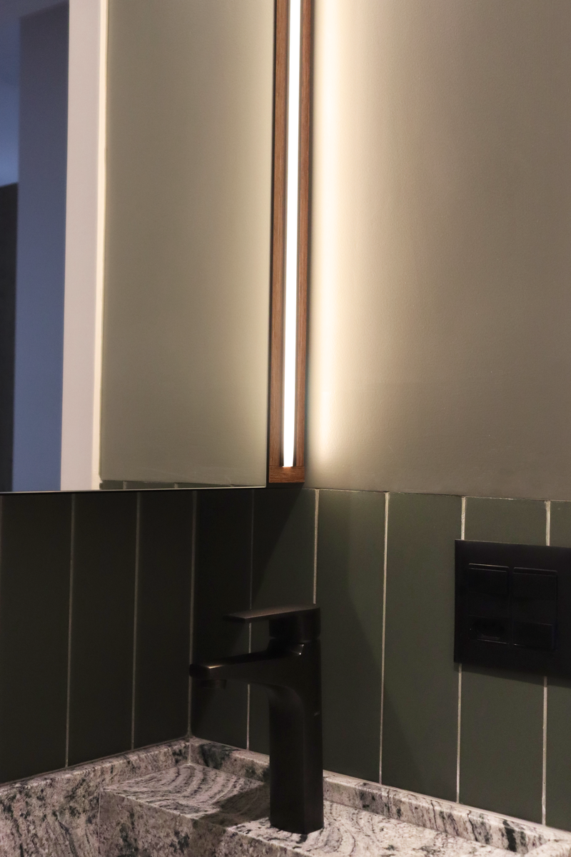 Na suíte, a meia parede com o Gouache Nuage - Portobello - trouxe leveza e ao mesmo tempo movimento, a pedra em quartzo branco, os metais cromados e a marcenaria em tom neutro deixaram o banheiro mais clean. O aconchego veio no espelho de madeira natural com iluminação indireta.