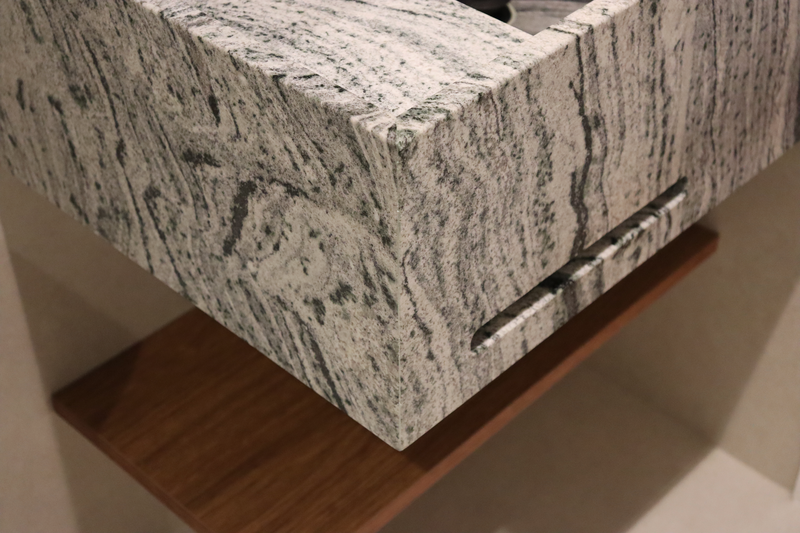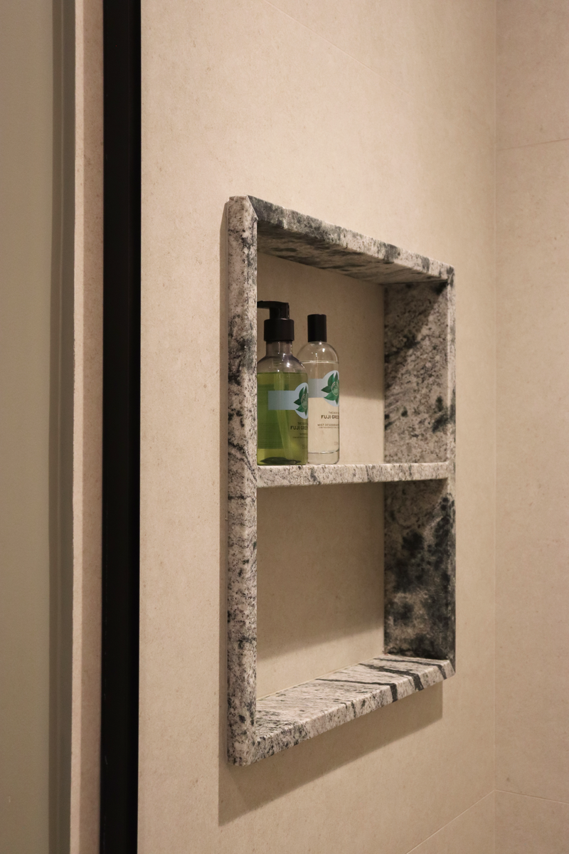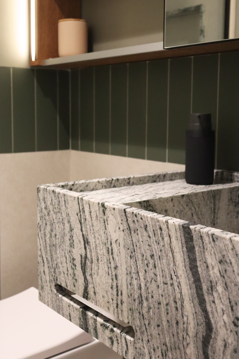 No banheiro social, a bancada com cuba esculpida em Granito Antartic White guiou todas as escolhas de materiais. O box piso teto isolou a parte social do banheiro, e a pintura na área externa combinada com os metais pretos trouxeram o ar de lavabo.
